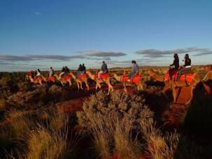 赤い砂丘の中をラクダに乗ってエアーズロックの日の出を拝みに行きます。**安全上の理由から5歳以下のお子様はご参加頂けません。