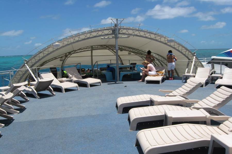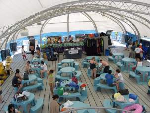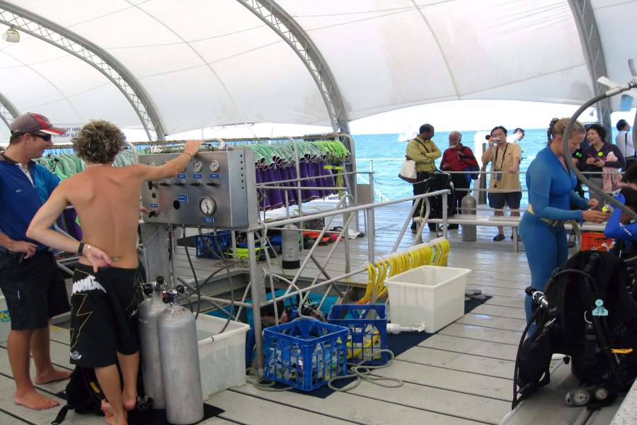 出発の15:30分までシュノーケル、体験ダイビングなど自由行動です。ポンツーンの地下にはガラス張りのリアル水族館もあります。