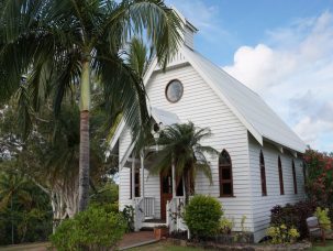 特にノープランの方が多いと思いますので、ハミルトン島のオススメな場所をご紹介します。ぜんぶハミルトン島の無料シャトルバスで行くことができます。まずはここ、ハミルトン島の教会。この協会で結婚式をあげるのはオーストラリア人の夢です!