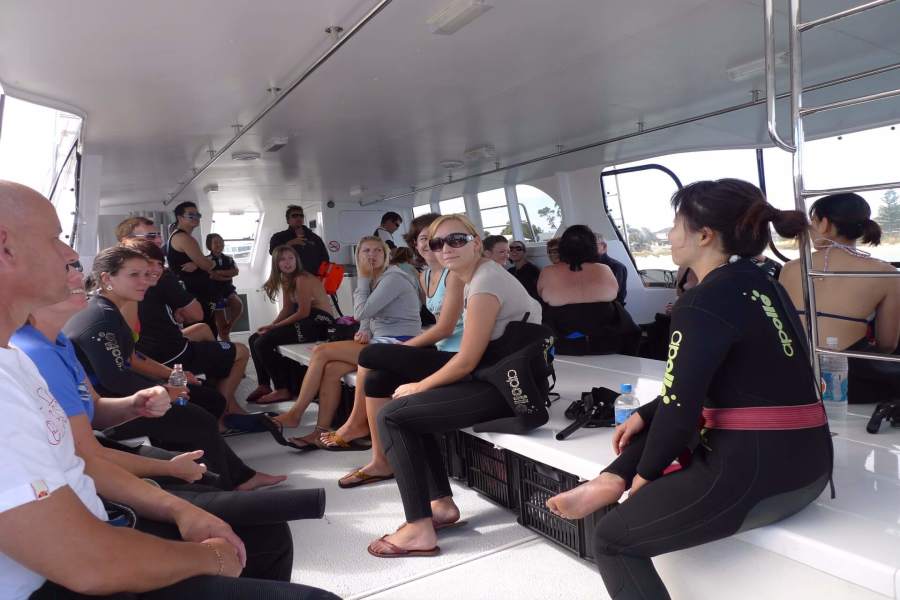 ツアーバスがロッキングハムビーチに到着後、クルーズに乗り換えてイルカの群れを探します。船の中でウエットスーツについての説明を聞きます。