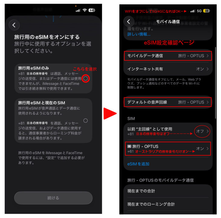 設定-> モバイル通信-> SIM=>日本の回線をOFFにして、オーストラリアのeSIMのアクティベートをお試しください。