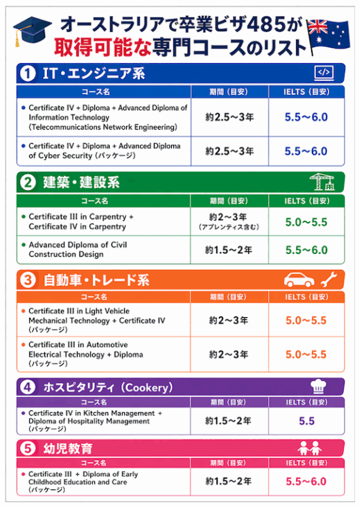 以下のコースを卒業したからといって無条件に卒業ビザ485を取得できる訳ではありません。年齢制限や、卒業ビザ申請時のIELTSスコアなども必要です。