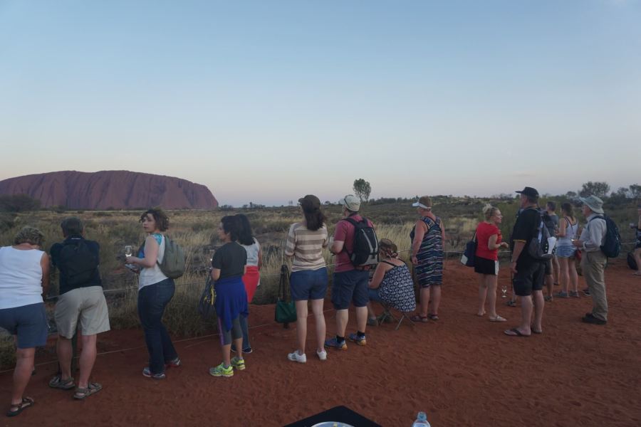 ウルル日の入り鑑賞の会場へ移動。スパークリングワインを片手に、真っ赤に染まっていくウルルの景色をお楽しみくださいませ。