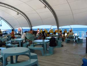 出発の15:30分までシュノーケル、体験ダイビングなど自由行動です。ポンツーンの地下にはガラス張りのリアル水族館もあります。